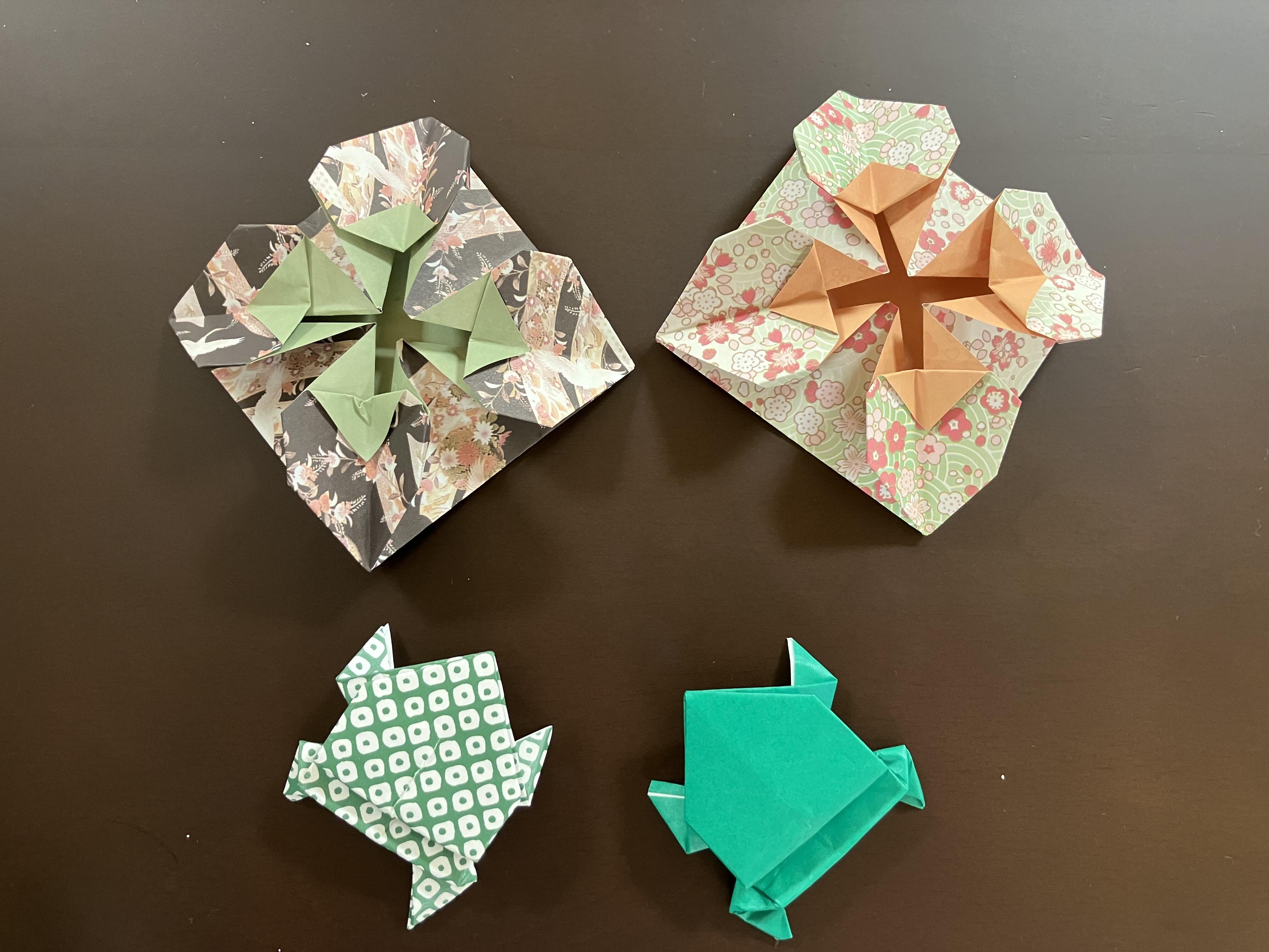 相談しながら、ぴょんぴょんカエルと花の完成です。