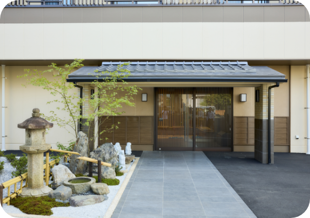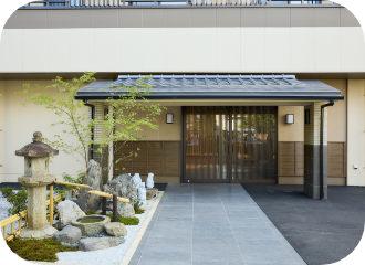 坪庭、七福神、屋根瓦をしつらえた日本伝統の趣きを感じる玄関を入ると、木材をふんだんに使用した、明るく温かみのあるエントランスホールが雰囲気がお客様をお迎えします。