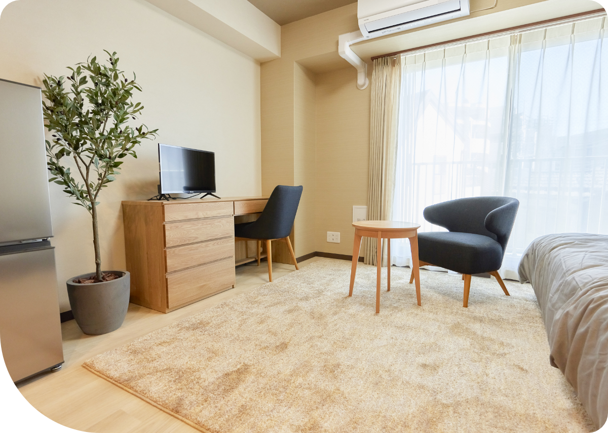 居室は全て個室で、キッチン・浴室付きです。内装や家具は和モダンなデザインを採用。家具は木や竹でできたものを選び、建具もご入居者様目線でこだわっています。
